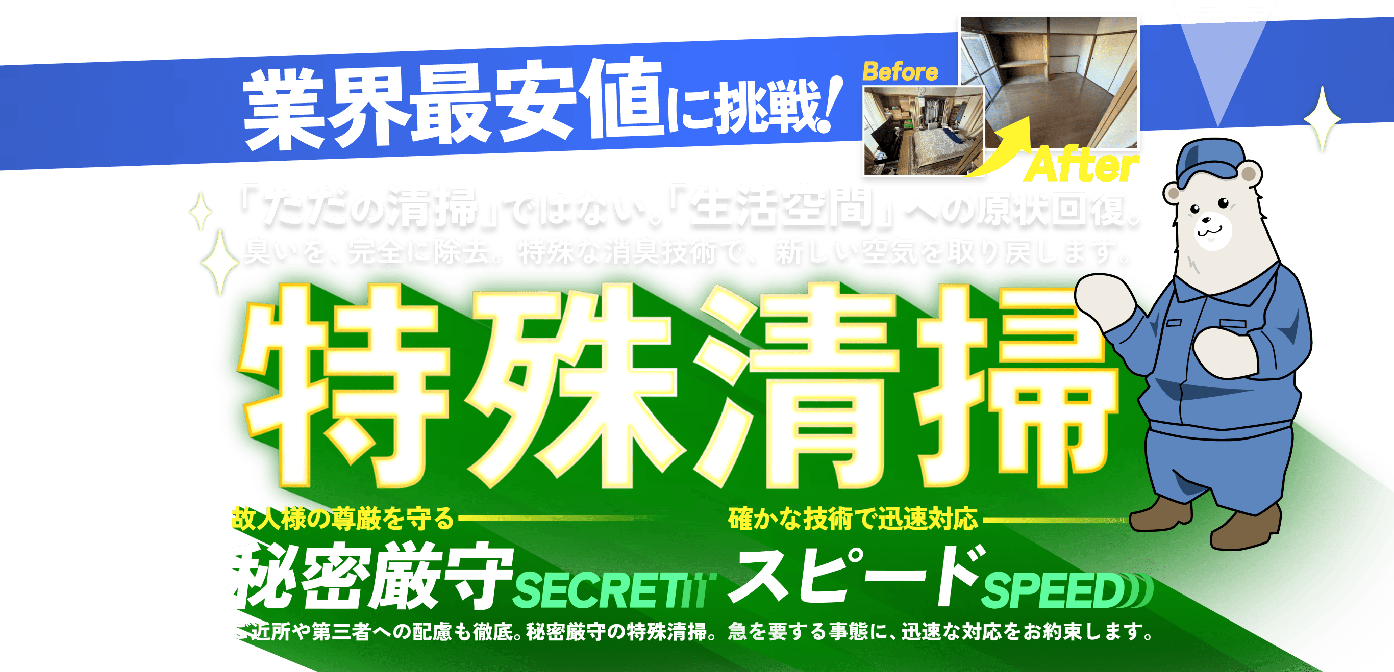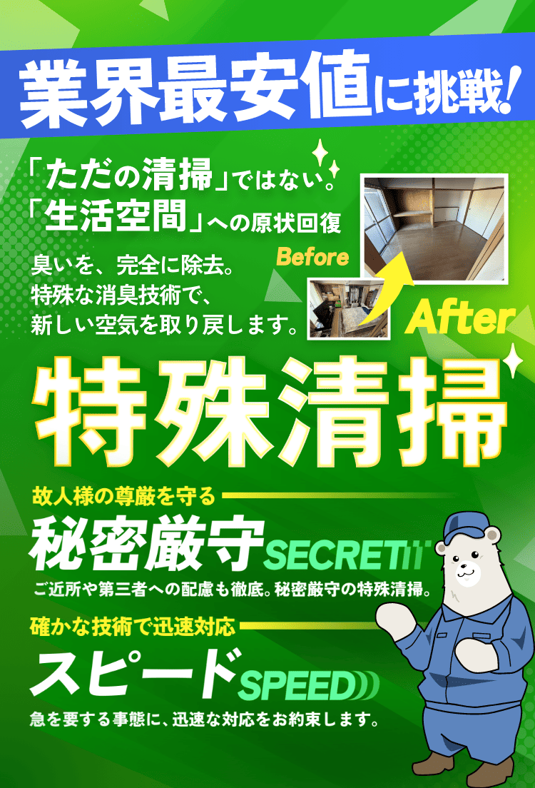 私どもは特殊清掃の専門知識と経験を活かし、確実な原状復旧をお約束いたします。